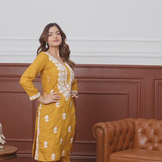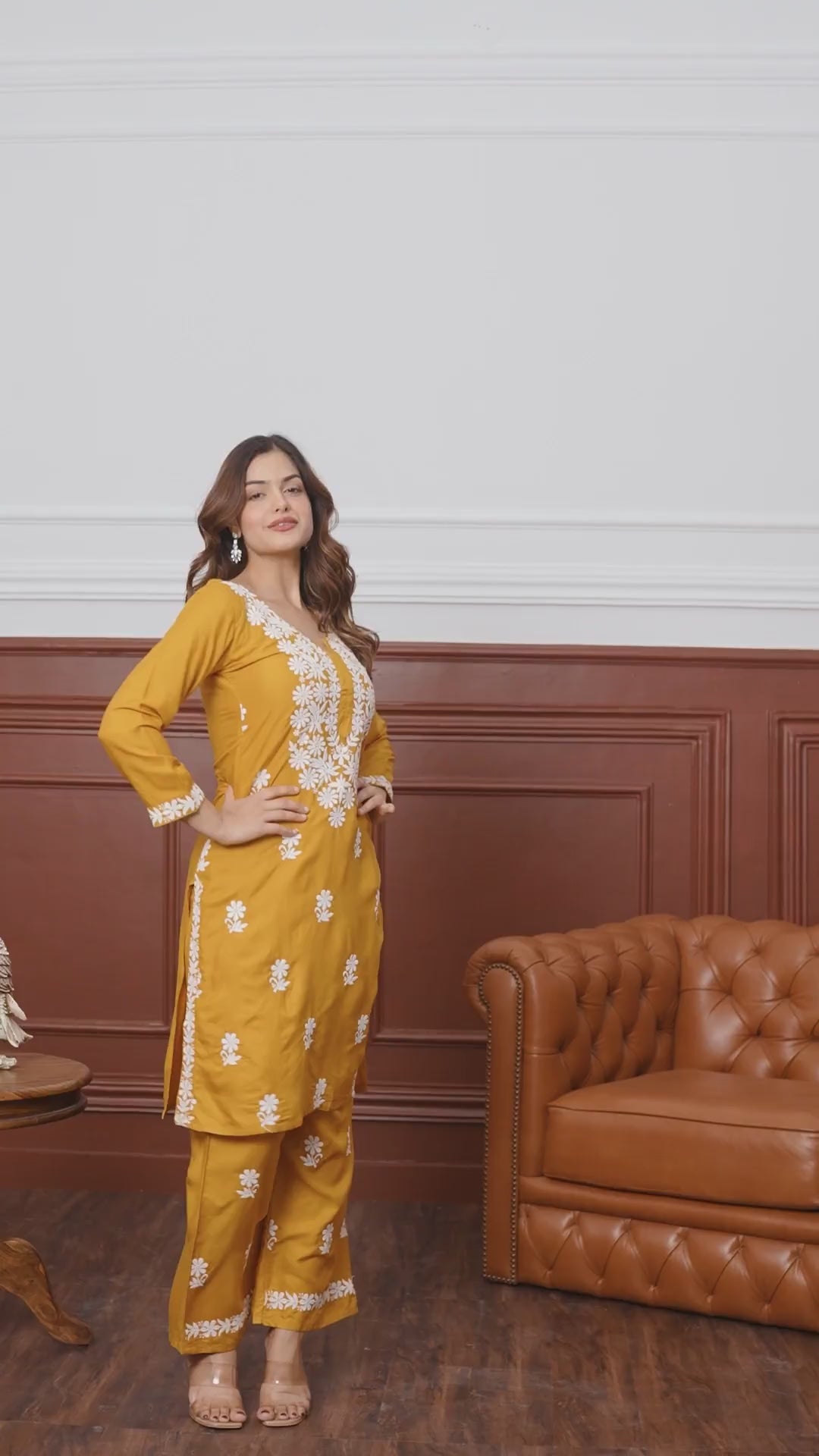 Yellow Rayon Cotton Chikankari Kurta With Palazzo For Women